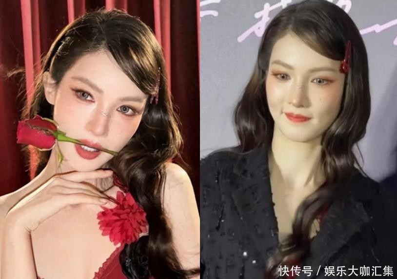 同样是长发披肩,同样身着红色礼服,她比身旁的杨幂更显稳重大气。