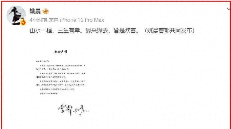 姚晨和曹郁终于把离婚这事摊开说了,虽然声明里写得挺体面,说为了孩子才拖到现在,以后还继续做朋友、一起搞事业,可大伙儿心里都跟明镜似的:这婚啊,估计早就离了。你想啊,2023年那会儿两人同框,中间硬是隔着个人,那生分劲儿哪像夫妻?难怪网友早就不信他们“恩爱如初”的戏码了。